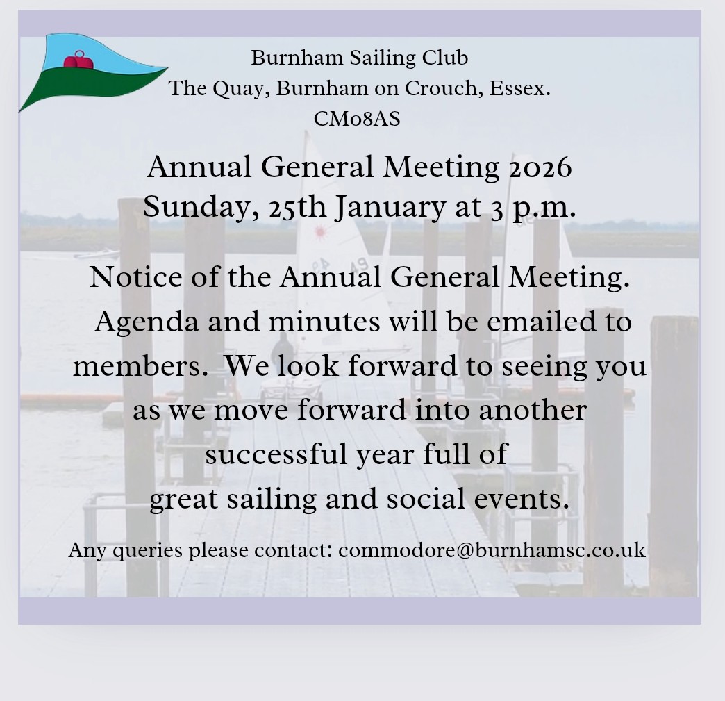 Notice of the Annual General Meeting, Agenda and Minutes have been sent out to all members via email. If you have not received an email please contact vicecommodore@burnhamsc.co.uk to obtain your copies.